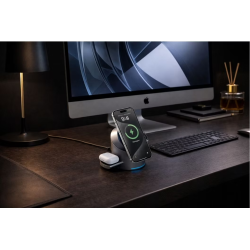 Il permet de recharger simultanément un smartphone, des écouteurs sans fil et une montre connectée à partir d’une seule station compacte.